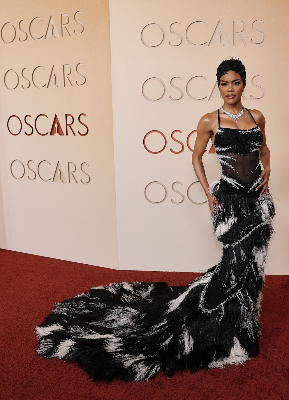 A big trend of the evening was feathers, with several of this year’s standouts wearing gowns embellished with them. Demi Moore wore a green and black feathered Gucci gown; Teyana Taylor was in a black-and-white Chanel gown with a feather train and sheer bodice; and Nicole Kidman wore a white Chanel corseted gown with feathers at the waist and train.